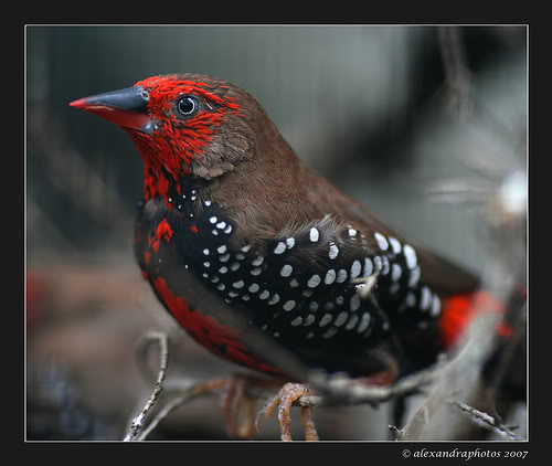 Masculino: testa e face, escarlate; lado superior, castanho acinzentado; bochechas, queixo e garganta, escarlate; lados da cabeça, castanho acinzentado; barriga, preto com pontos brancos redondos; faixa vermelha ao longo do peito e barriga.